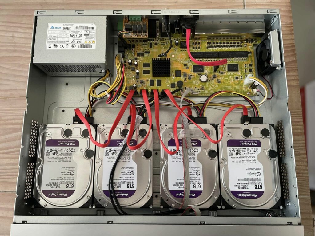 - Photo du NVR ouvert avec les disques WD Purple installés