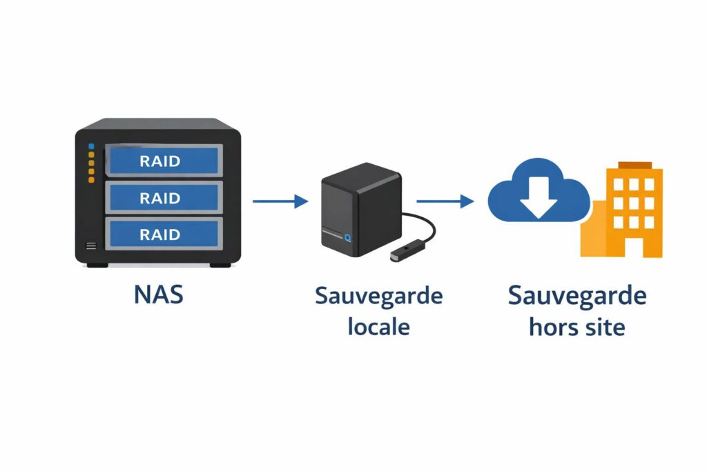 Autrement dit : on applique la logique 3-2-1. Le RAID n’est pas une “copie de sauvegarde”, c’est l’architecture de stockage de l’original.