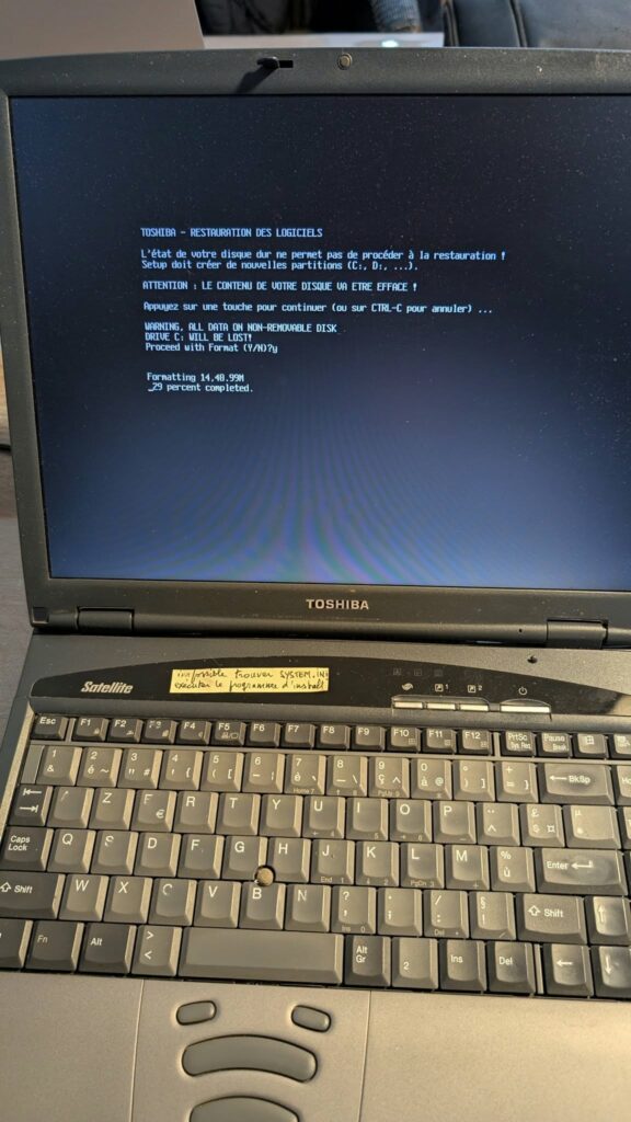 Le poste concerné était un ordinateur portable Toshiba d’époque, fonctionnant sous Windows 98.