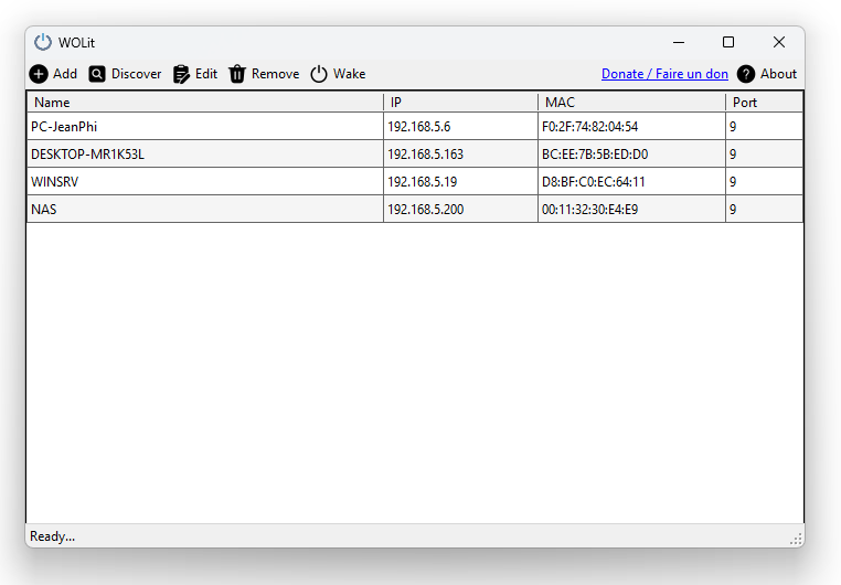 L’application propose également une détection automatique des machines présentes sur le réseau afin de faciliter leur ajout. Il est aussi possible d’ajouter des machines manuellement (adresse MAC, IP, nom).